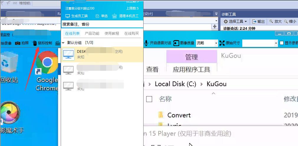 灰鴿子怎樣遠程控制電腦的鼠標鍵盤?配圖。鼠標控制即同時遠程控制操作鍵盤。注意,該功能不是鍵盤記錄,兩碼事。鍵盤記錄指的是記錄對方鍵盤操作而不是管控對方鼠標鍵盤。
