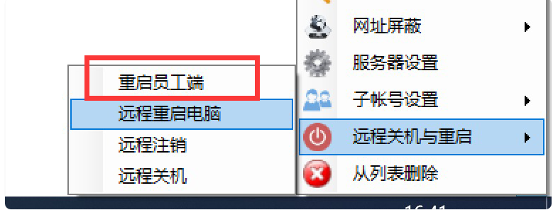 升級版本不需要重裝員工端,只需要重啟員工端即可。選中員工,右鍵,找到遠程重啟與關(guān)機,子菜單里面有個遠程重啟員工端。員工即可擁有最新功能。