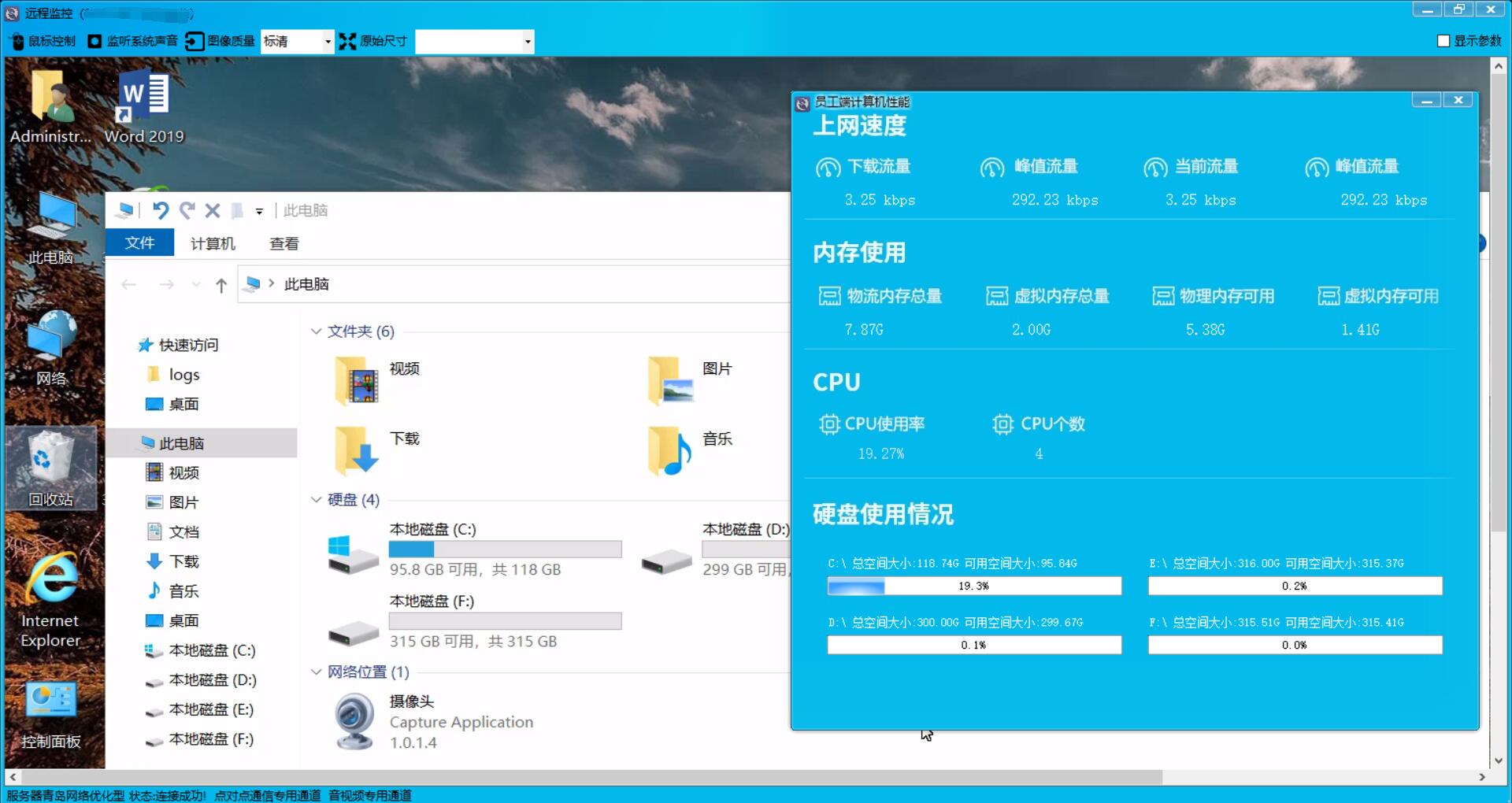 新界面灰鴿子遠(yuǎn)程控制遠(yuǎn)程效果還是很不錯的,而且提供了計算機性能查看??梢赃h(yuǎn)程查看電腦的實時CPU、內(nèi)存、硬盤等情況。方便我們管理人員使用。