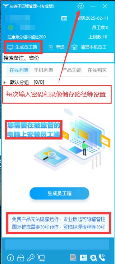 登陸之后會(huì)看到提醒“您需要在被監(jiān)管的電腦上安裝員工端” 點(diǎn)擊生成員工端,把它安裝到被控制電腦,經(jīng)理端會(huì)看到上線(xiàn)。