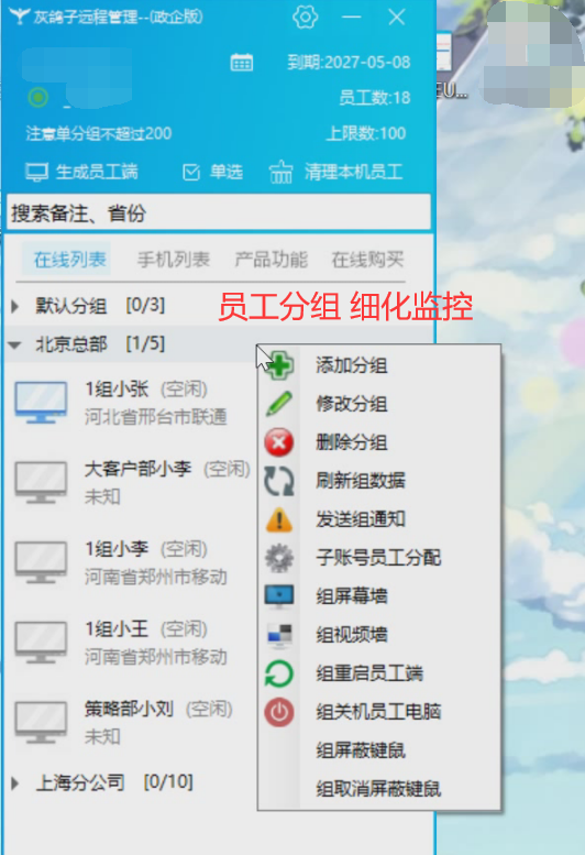 之所以說(shuō)灰鴿子轉(zhuǎn)型做企業(yè)安全了是因?yàn)樗泻芏鄬iT針對(duì)企業(yè)的功能,比如子賬號(hào)免費(fèi)下放。這個(gè)功能是給管理者層層下放監(jiān)督權(quán)限用的,免費(fèi)設(shè)置好子賬號(hào)以后就可以分給組長(zhǎng),部門長(zhǎng)這些。然后權(quán)限也是主控設(shè)置,可以隨時(shí)改隨時(shí)收回。這個(gè)功能小編沒(méi)有用過(guò)啊,但是這個(gè)功能是不是可以少買很多臺(tái)被控?