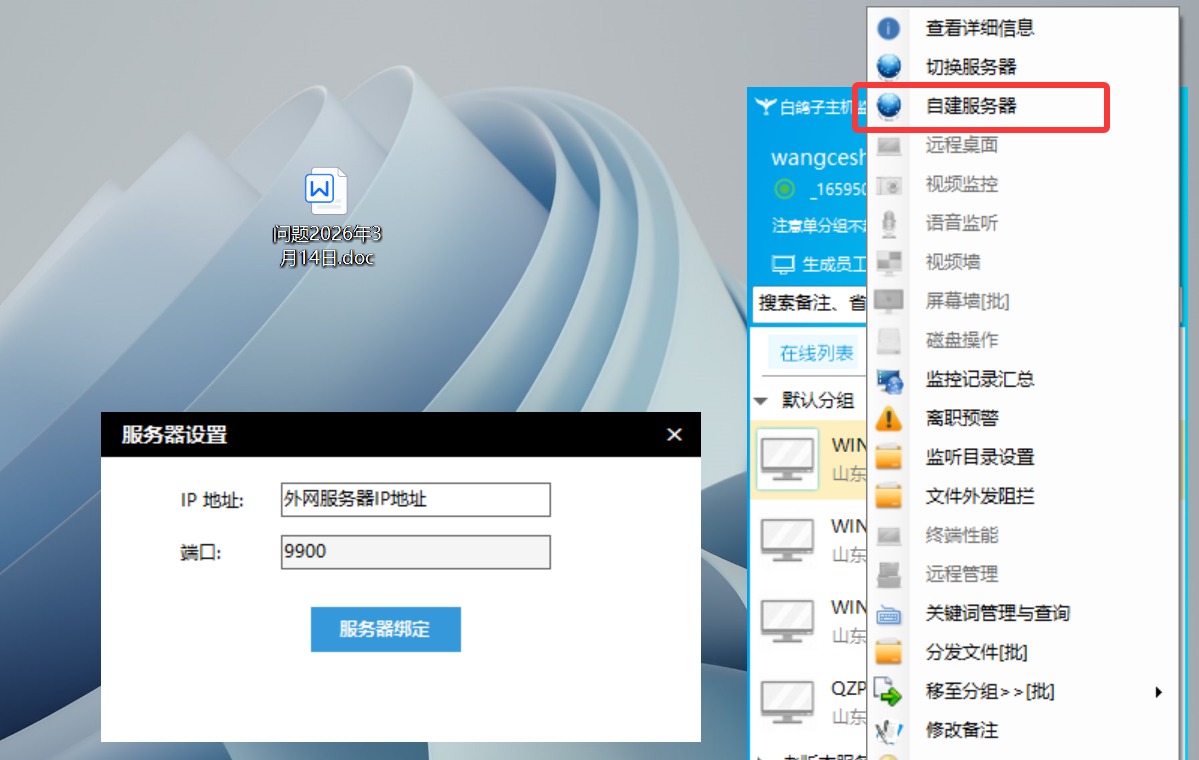自建服務(wù)器顧名思義:所有的經(jīng)理端(含子賬號)和員工端都走自建服務(wù)器。以被控端所在地為準(zhǔn)。不支持純內(nèi)網(wǎng)環(huán)境。如果你的被控在美國。主控在國內(nèi)。那么服務(wù)器應(yīng)該自建到美國區(qū)會更流暢。限制windows系統(tǒng)64位。不支持32位。