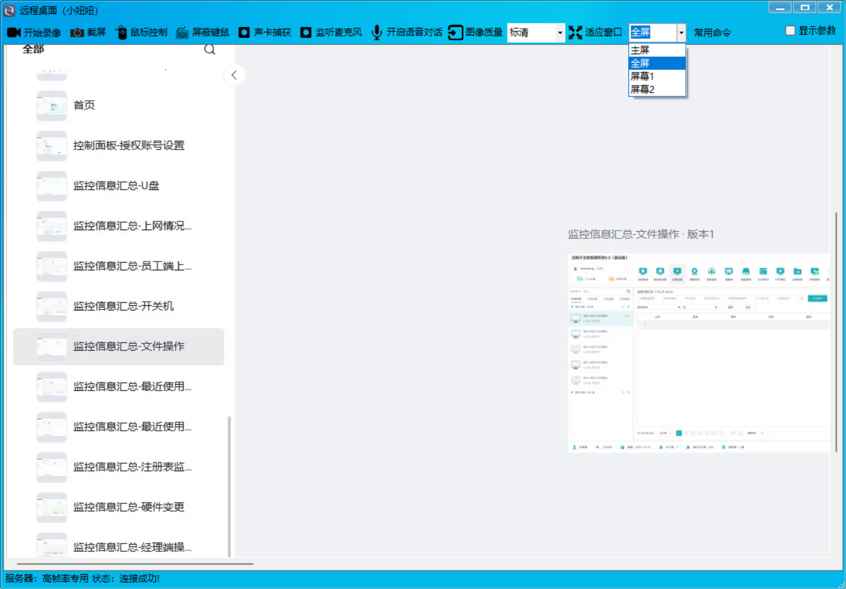 灰鴿子遠(yuǎn)程控制支持一主機(jī)多顯示器場景。當(dāng)被控電腦連接了多個(gè)顯示器時(shí),經(jīng)理端遠(yuǎn)程桌面窗口頂部工具欄提供“切換顯示器”按鈕,可自由選擇查看第1、第2……第N個(gè)屏幕畫面。無需額外配置,點(diǎn)擊即可切換,完美適配監(jiān)控大屏、炒股多屏、設(shè)計(jì)工作站等需求。配圖示意切換操作,一目了然。