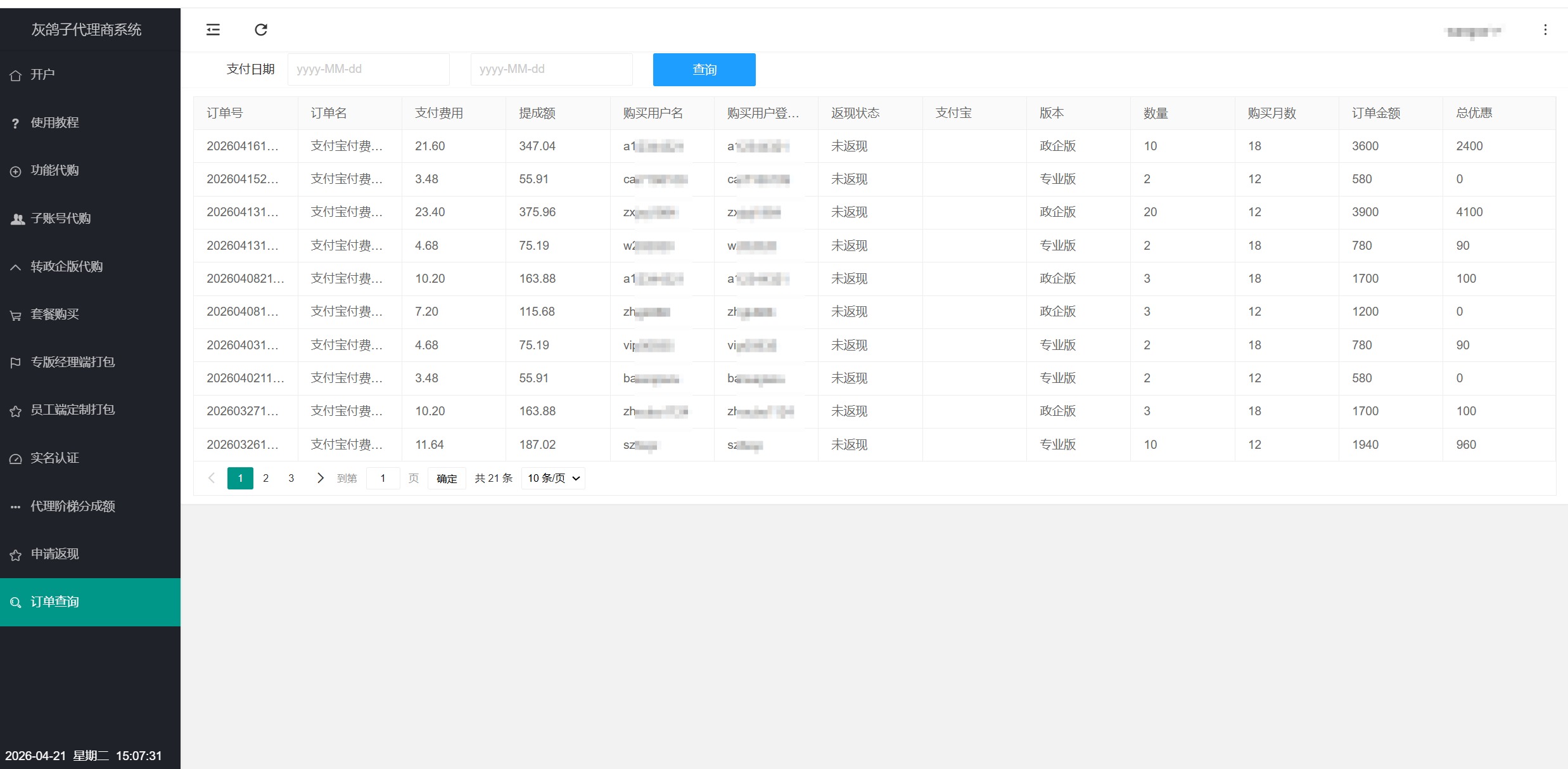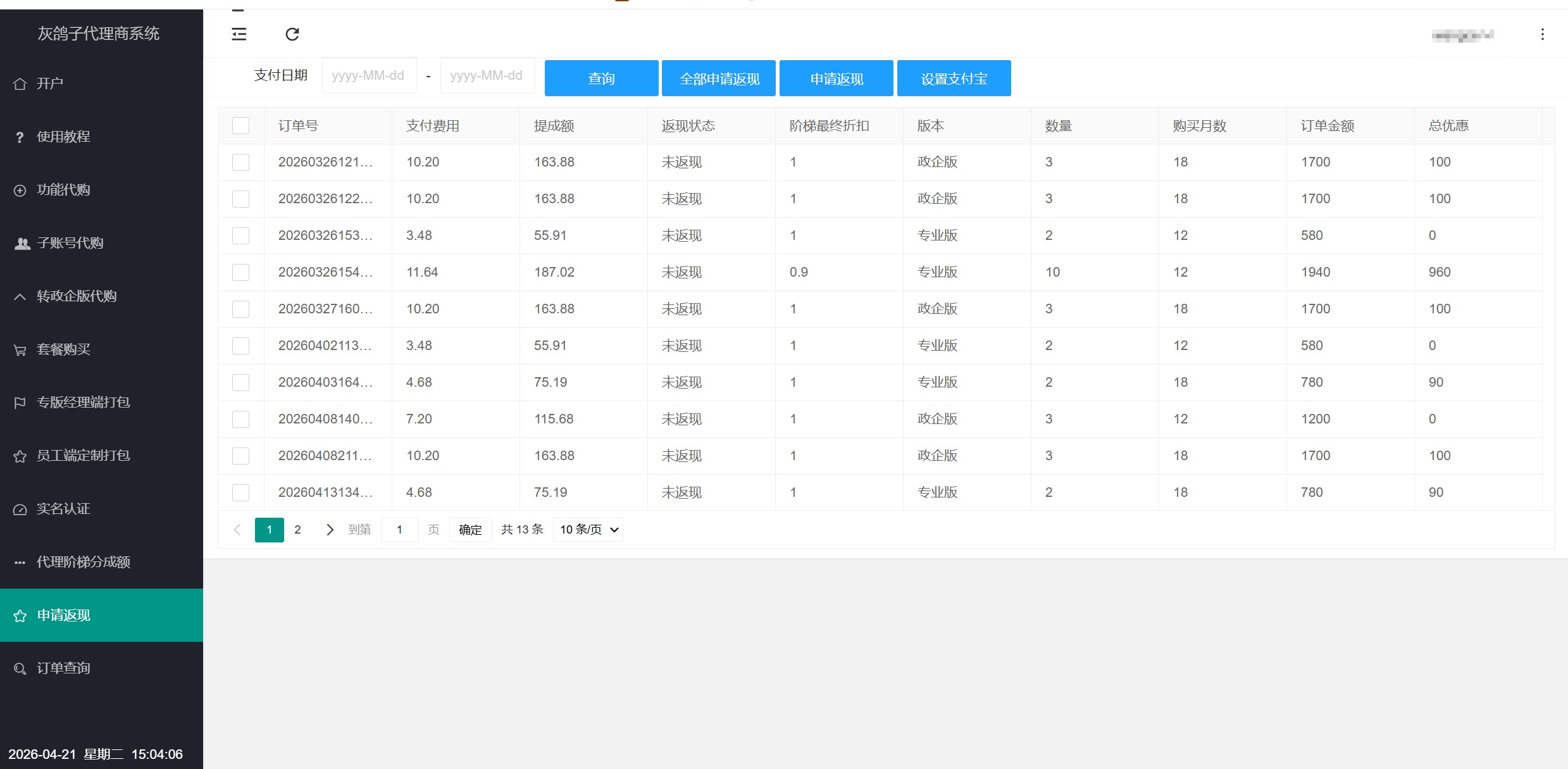 無(wú)需等待,現(xiàn)在購(gòu)買(mǎi)灰鴿子任意付費(fèi)套餐,即可自動(dòng)激活代理權(quán)限。您可以將自己的代理后臺(tái)分享給下屬,組建您的分銷(xiāo)團(tuán)隊(duì),坐享團(tuán)隊(duì)提成。