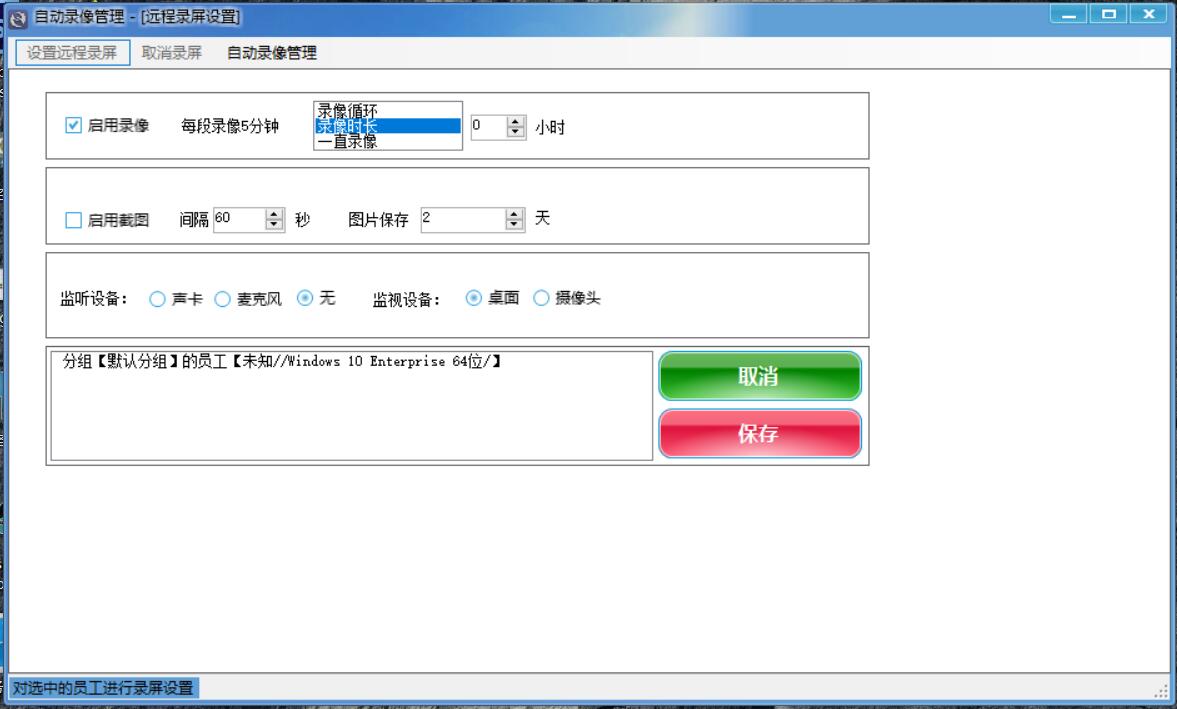 同時(shí)支持遠(yuǎn)程桌面、視頻的前臺(tái)及后臺(tái)錄制,錄制內(nèi)容可根據(jù)期和員工分類在經(jīng)理電腦保存,支持調(diào)節(jié)畫質(zhì)、循環(huán)錄制、及是否同時(shí)錄制聲卡或麥克風(fēng).